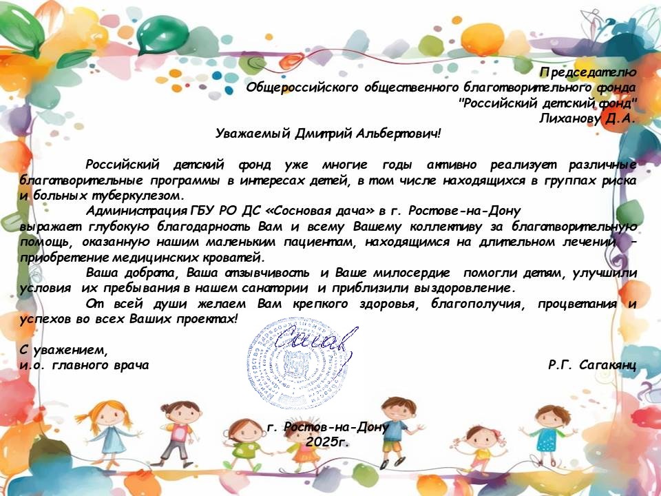 ГБУ РО «Детский санаторий «Сосновая дача» выражает искреннюю признательность и благодарность коллективу ООБФ «Российский детский фонд» за многолетнее, плодотворное сотрудничество в интересах детей, находящихся на длительном лечении.